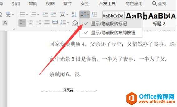 点击之后,在下拉列表中,我们勾选显示段落标记,这样就可以显示出来隐藏的分页符了: