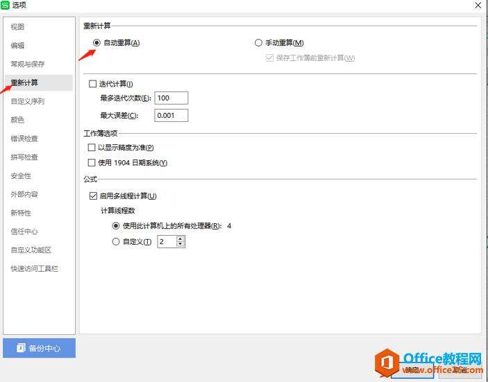 我们在弹出的对话框选择第四项【重新计算】,选择右侧的自动重算,最后点击确定: