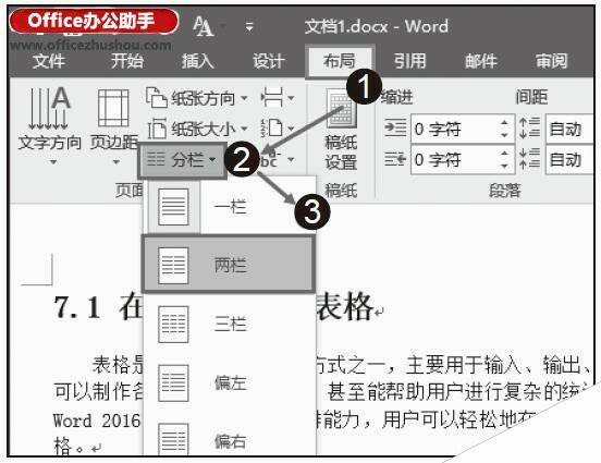 步骤2:在展开的分栏列表菜单中,可以看到Word 2016所提供5种分栏方式,分别是“一栏”“两栏”“三栏”“偏左”和“偏右”。如选中“两栏”选项,即可以“两栏”方式编排文档,效果如图2所示。