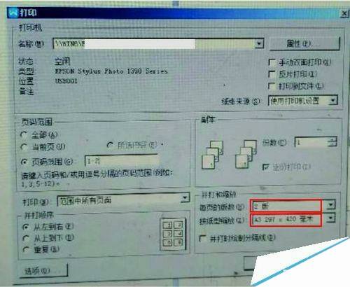 4、选择打印机名称,再选择“并打和缩放”中每页的版数 "2版",“按纸型缩放”“A3尺寸”,如图所示