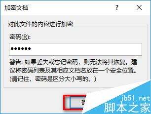 输入密码点击“确定”。一定要注意如果你以后忘记了密码,那么这片文档就打不开了,而且密码区分大小写。