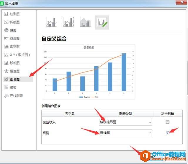第二步:在弹出的【插入图表】对话框内,选择【组合图】。将数据大的营业收入设置为【簇状柱形图】,数据小的利润设置为【折线图】并且勾选【次坐标】,点击【插入】: