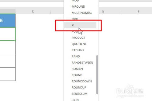 2、其次点击“公式-数学和三角函数”表中选中PI