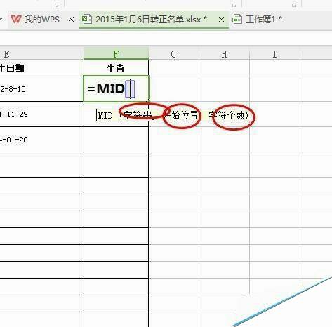 2、我们再在F这一栏也就是生肖这个列,我们先输入=mid()函数。这个函数的意思的引用一个字符串我们从第几个开始选择几个。