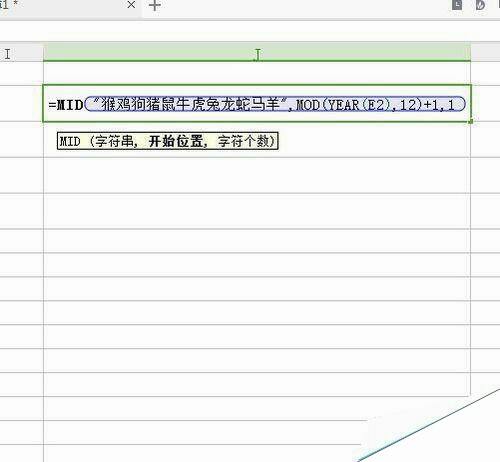 8、最后我们在看输入的是我么要取出多少个,我们应该取得的一个,因为人的生肖就是一个。公式:=MID("猴鸡狗猪鼠牛虎兔龙蛇马羊",MOD(YEAR(E2),12)+1,1)