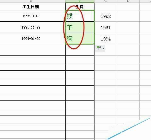 9、最后我们看下求出之后我们下拉一下就可以把后面的生肖都填充料。