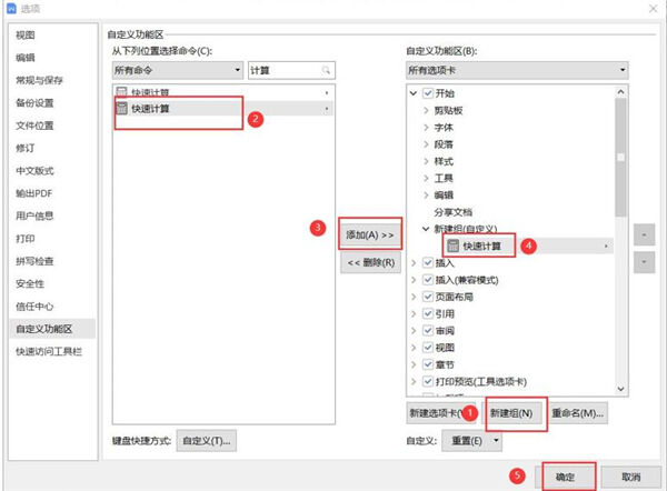 这时候会弹出一个选项的对话框,我们点击自定义功能区,在自定义功能区中,我们点击所有命令在旁边搜索计算,这时候就会出来两个快速计算的工具: