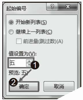 步骤2:打开“起始编号”对话框,在“值设置为”框中,将起始值设置为“5”。设置完成后,单击“确定”按钮,如图2所示。