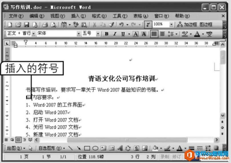 1、在“写作培训.doc”文档中将文本插入点定位到要插入特殊符号的位置,这里定位到“青语文化公司”后面。