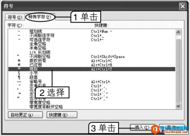 2、选择【插入】→【符号】菜单命令,在打开的对话框中单击“特殊字符”选项卡,在列表框中选择要插入的“商标”选项,单击插入按钮,如图3所示。