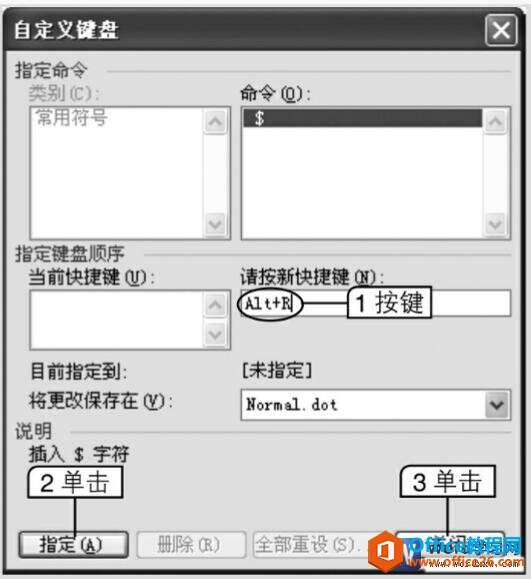 3、打开“自定义键盘”对话框,在“请按新快捷键”文本框中按下要指定的快捷键【Alt+R】,如图4所示。