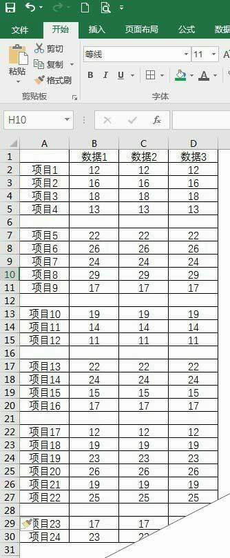 2、在工作表中录入制作柱状图的数据,把数据进行分组,中间插入空行占位。