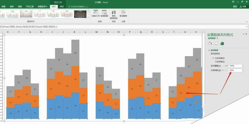 6、双击柱形,在右侧自动打开的设置窗口中,把【分类间距】设置为0,则各组数据之间没有了空白。