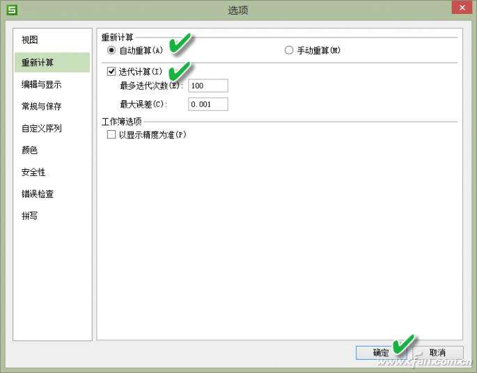 因为公式中存在迭代计算问题,所以必须要进行一项非常重要的设置:通过“WPS表格→工具→选项”,将“重新计算”项目下的“迭代计算”选中。注意还要保证“自动重算”并选中。