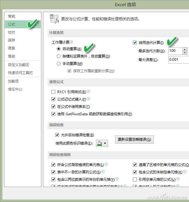 下面讲述的是WPS表格中的实现方法。Excel中稍有不同之处是迭代计算的设置位置。以Excel 2013为例,需通过“Excel选项”窗口下的“公式→启用迭代计算”启用迭代功能。
