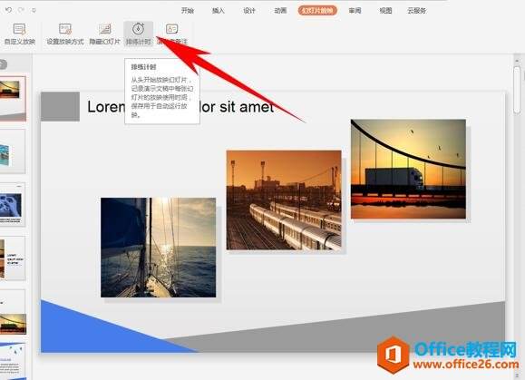 然后单击工具栏幻灯片放映下的排练计时选项。