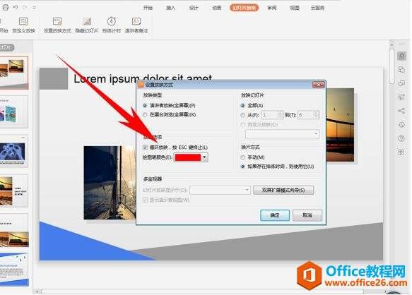 弹出设置放映方式,将放映选项下的循环放映,按Ese键终止前打上对勾,单击确定即可。