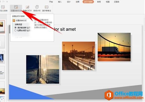 然后返回编辑界面,单击工具栏幻灯片放映下的设置放映方式。