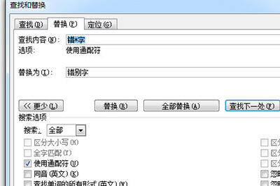 在查找内容选项中我们输入要找的错别字类型,比如错*字。这个星号就是代表通配符,只要确定开头第一个字和最后一个字,中间部分就能替换指定内容了。然后点击更多勾选【使用通配符】,并在替换中输入正确的词语。