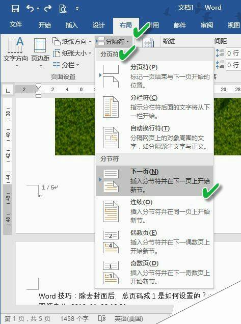 其实这个问题可以借助于“节”及其属性延续的设置来搞定。在上图的版面中,将光标打到封面图片之后,依次选择“布局→分隔符→分节符→下一页(插入分节符并在下一页上开始新节)”。