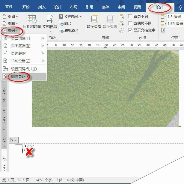 之后,将光标打到封面的页脚处,依次点击“设计→页码→删除页码”。这样封面的页码就去除了。