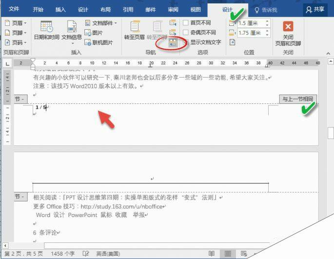 那么,封面下方难看的页码如何去除呢?这时不能贸然去第一页中删除页码,因为下一页的页眉页脚属性目前处于“与上一节相同”状态,若是删除了,则正文中的页码也没有了。这时需要将光标定位于第二页的页脚,然后通过“设计”菜单中的“链接到前一条页眉”按钮,将与前一页的页脚的属性关联“斩断”。