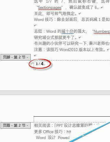 但是,细心的你可能已经发现,页码的总数没有减去封面的1页,最后一页的页码变成了4/5,那么5/5这页哪里去了?这好像有点不合乎逻辑。如何更正呢?我们只需选中页脚页码区域 1/5 的5数字,鼠标右键单击,选择“编辑域”,然后将“Numberpages”改为“Sectionpages”。