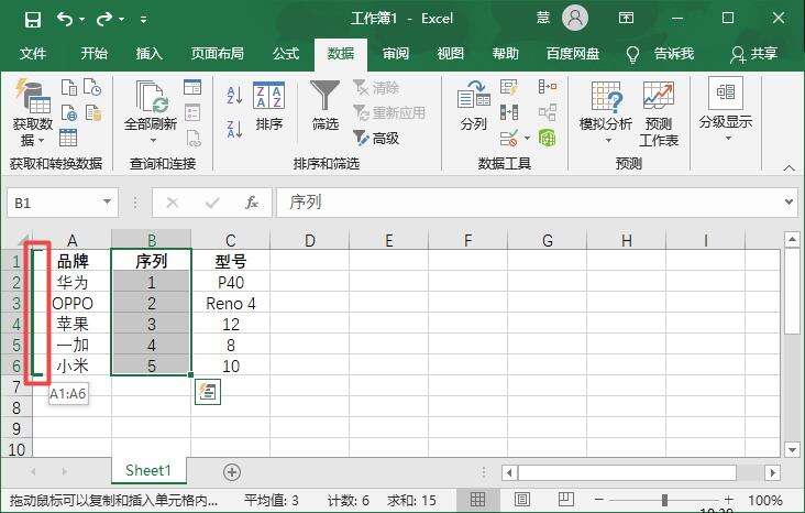 4、松手后,就可以将A列和B列的数据互换,结果如下图。
