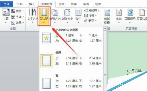 点击上方“页面布局”选项卡下的“页边距”按钮,选择自己想要的软件默认的页面边距,如图所示。