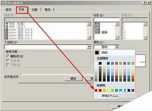 我们在格式对话框中,首先可以设定一下字体,我们让字体显示为红色,这个比较显眼