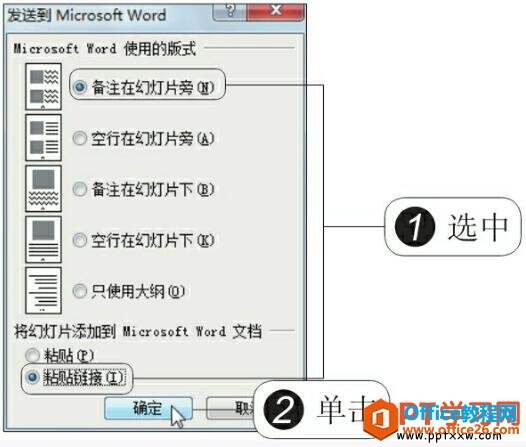 弹出“发送到Microsoft Word”对话框,选中“备注在幻灯片旁”和“粘贴链接”单选按钮,单击“确定”按钮,如下图2所示。