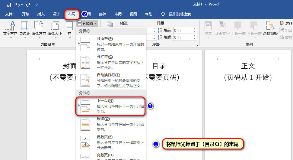1、将鼠标光标置于【目录页】末尾,点击菜单栏的【布局】选项卡,在【页面设置】工具组中点击【分隔符】,选择【分节符】中的【下一页】。