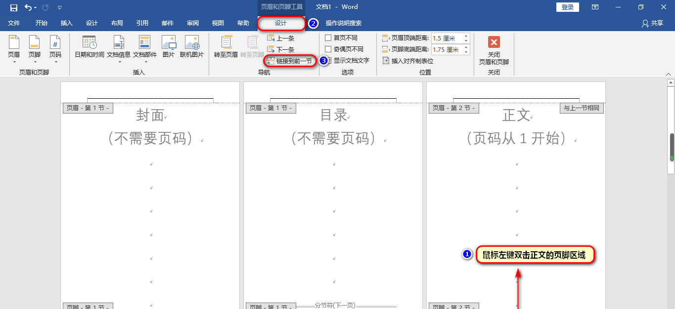 1、鼠标左键双击正文的页脚区域,在选项卡处多了【页眉和页脚工具】的【设计】选项卡,在【导航】工具组中取消选中【链接到前一节】。默认是灰色选中状态。