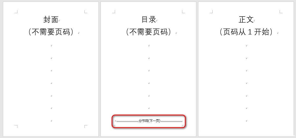 2、可以看到目录页底部有我们插入的【分节符(下一页)】的提示。插入分节符可以将文档分成两节,分节符之前是第一节,分节符之后是第二节。