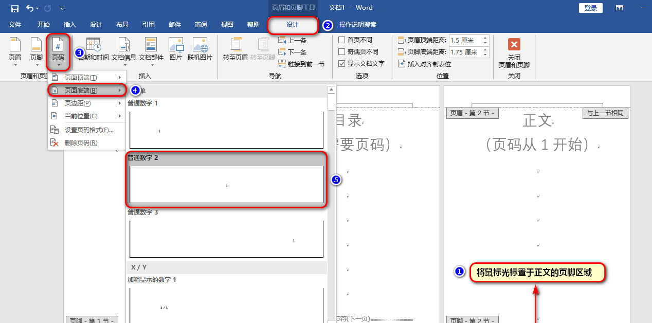 1、将鼠标光标置于正文的页脚区域,点击页眉和页脚工具下方的【设计】选项卡,在【页眉和页脚】工具组中点击【页码】,选择【页面底端】,选择【普通数字2】。
