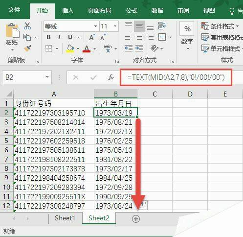 下图的表格中已有身份证号码,出生年月日一列就没必要重新填写了,可自动生成,这是因为身份证号码中就包含了出生年月日的信息。只需在B2单元格输入如下公式并向下填充B列即可: