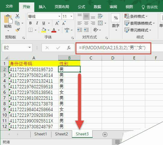 在身份证号码中虽然直接看不出性别,但其中的某些位数却暗含着性别信息,通过简单运算可得知男女性别。我们只需在B2单元格输入如下信息并向下填充该列即可: