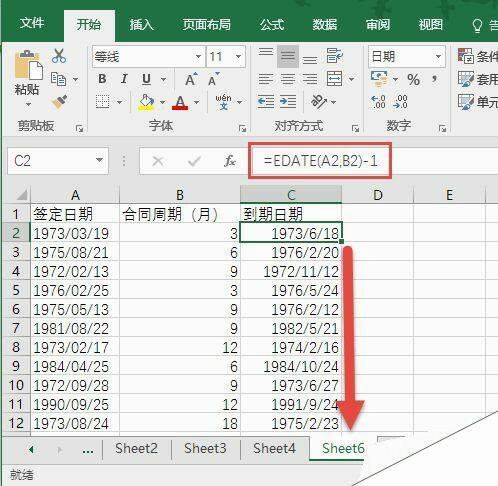 在如下图所示的C2单元格中输入上述公式并用填充柄填充C列,即可自动获得到合同的到期日期。