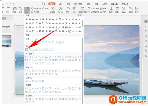 首先第一步,将图片拉大,与幻灯片背景对齐,当做封面的背景图,然后单击工具栏当中的插入,在形状下选择矩形。