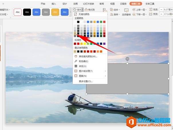然后在幻灯片中插入一个矩形,然后选择一个合适的颜色填充,注意不要与背景颜色相差太大,选择相配的颜色最重要。