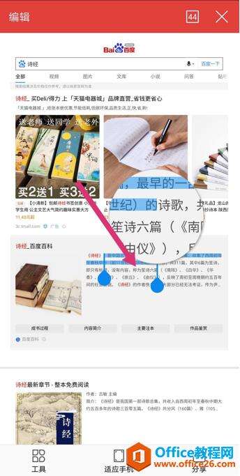 第二步,用手指选择一段文字并长按,上下或左右滑动操作,就会弹出放大镜,把字体放大,更容易查看: