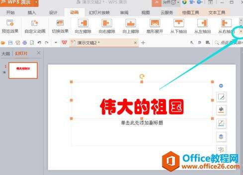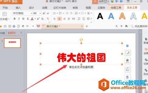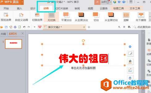 2.选择需要设置动画的对象,可以是文字框或者是图片等,这里输入文字标题对象