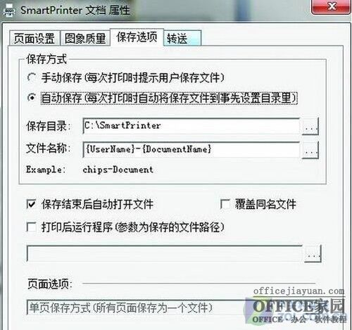 二、如果你有大量的Word文档需要转化,建议先设置一个固定的存档文件夹,这样就不需要每次打印时再去手动选择一遍保存路径了,设置方法为:进入“保存选项”页面,勾寻自动保存”;为其选一个保存目录,在批量转化文档时记得将“保存结束后自动打开”前的“√”去掉。