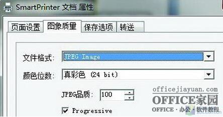 三、这台Smart Printer虚拟打印机支持将Word文档打印成PDF、BMP、JPEG等多种格式。想要选择输出格式的话,可以进入“图像质量”选项卡,在“文件格式”下拉菜单中选择想转换的格式;以图片为例,接着设置好颜色位数、JPEG品质等参数,点击“确定”切换回打印页面即可打樱