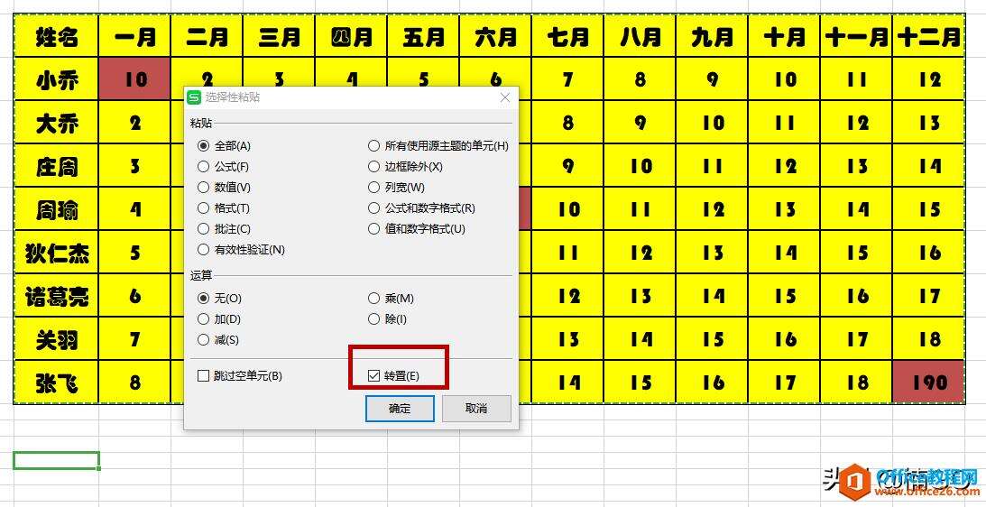 在打开的“选择性粘贴”窗口中,勾选“转置”选项,确认完成。