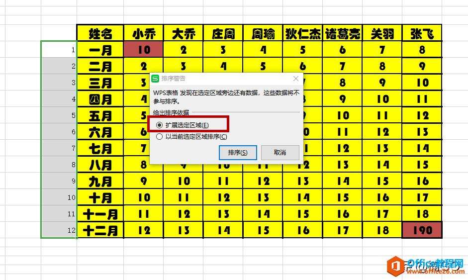 此时,会弹出一个“排序警告”窗口,选择“扩展选定区域”,确认完成。