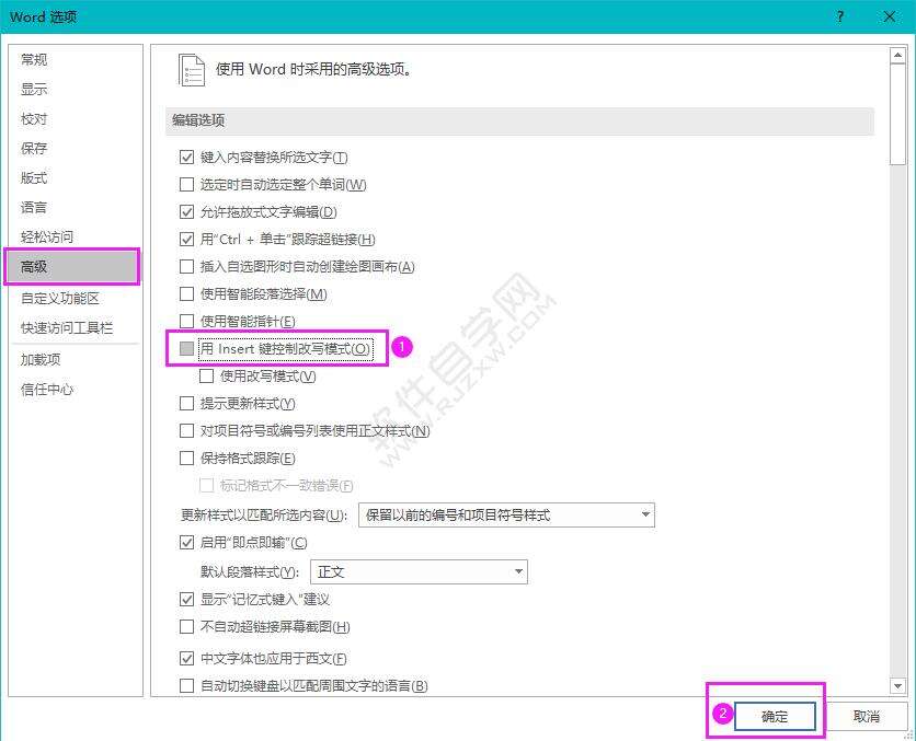 3、弹出Word选项,点击高级功能,取消勾选用lnsert键控制改写模式,点击确定。