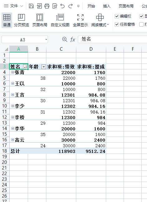 3.最后在数据透明表中就可以发现姓名的相关数据与单元格的行列字段顺序发生了变化,被移动在年龄单元格的后面了