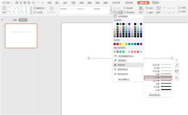 2、选中直线,颜色填充为灰色,线条宽度设置为1.5磅;