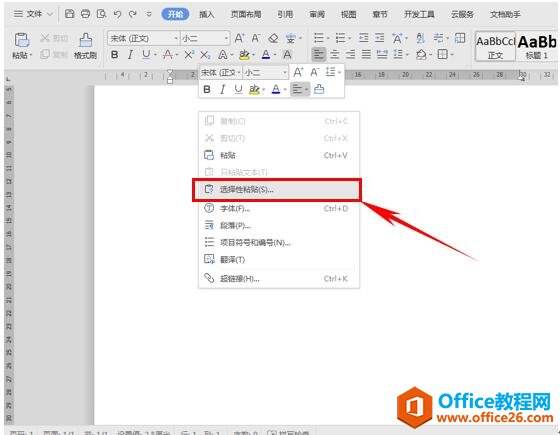 然后打开WPS文档,单击鼠标右键,选择“选择性粘贴”。